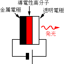 導電性高分子薄膜は、電圧をかけることにより発光するエレクトロルミネッセンスを示し、発光ダイオードとしての利用が期待されています。