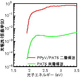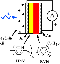 導電性高分子を使って、光を電気に変える光電池を作製することができます。さらに、この素子を用いて色センサなど様々な機能性を備えたデバイスを作ることができます。